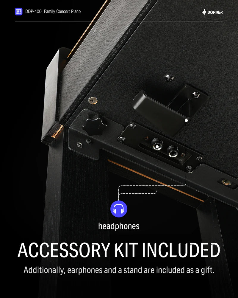 The Donner DDP-400 brings the sophistication and resonance of a traditional upright piano into the modern home. Designed for serious students and experienced players alike, it pairs an elegant, furniture-style cabinet with advanced digital sound engines, delivering an uncompromised playing experience without the maintenance of an acoustic instrument.