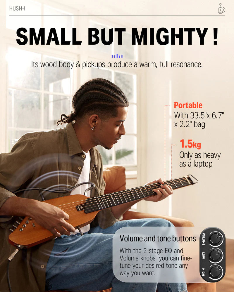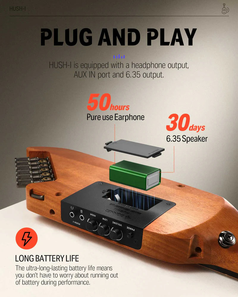 Authentic Acoustic Tone Despite the minimalist solid-wood frame, the HUSH-I sounds massive when plugged in. It features a custom-designed piezo pickup and an onboard active preamp. Dial in your perfect tone using the built-in Volume, High, and Low EQ knobs. A dedicated "Phase" button instantly eliminates the feedback loops that plague traditional acoustic guitars on loud stages.