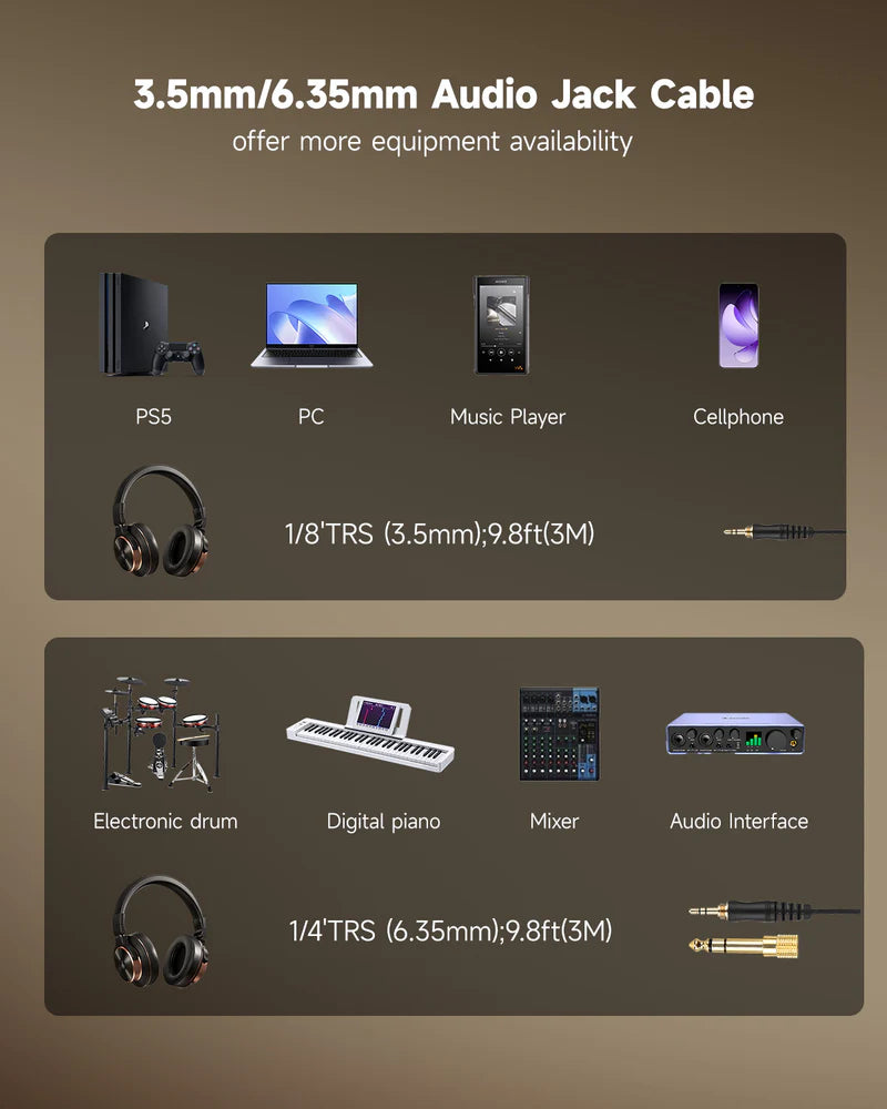 Versatile Studio Connectivity Built for the rigors of the studio, the headphones feature a detachable coiled spring cable that stretches up to 3 meters, preventing tangles and giving you room to move around your gear. It includes both a standard 3.5mm jack for everyday devices and a 6.35mm (1/4") adapter for plugging directly into audio interfaces, amps, and digital pianos.