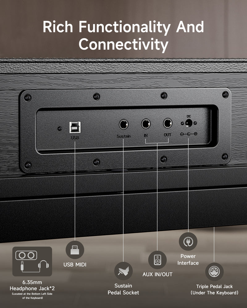 Wireless & DAW Integration Dual-Mode Bluetooth allows you to stream audio directly through the piano's high-fidelity speakers or wirelessly transmit MIDI to your smartphone or tablet. For studio integration, the Universal USB MIDI output provides plug-and-play connectivity to Windows, Mac, Android, and iOS for triggering your favorite virtual instruments.